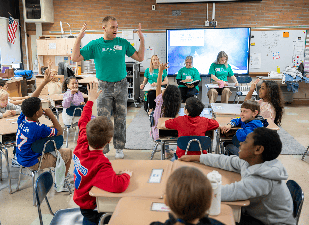 In this year’s Young Playwrights Project (YPP), third and fourth grade students from eight schools across Chautauqua County sent in over 520 plays that shared their original stories. In early April, over 40 Institution staff and Chautauqua community volunteers formed Play Reading groups and rehearsed. They then traveled to the schools to stage play readings in their classrooms, bringing the students’ words and ideas to life. Joined by Chautauqua Arts Education’s team of talented teaching artists — led by Alex Nader and including Andrew Barbato, Emily Olcott, Gaby Hornig, Marissa Miller and Marty Miller — every student got to hear their plays and receive praise and encouragement from adults and peers alike.