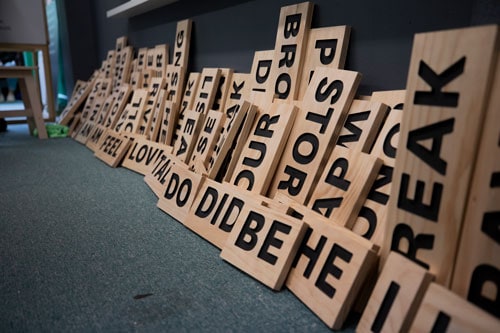 From digital poems to more tactile methods of creating and exploring poetry, guests of all ages can enjoy the Makerspace. Contribute a stanza to our digitized community Thread Poem or create your own erasure poem using our blackout poetry app Emerge. And, for more of a hands-on learning experience, visitors can explore our word wall, creating their masterpieces with wooden word blocks.