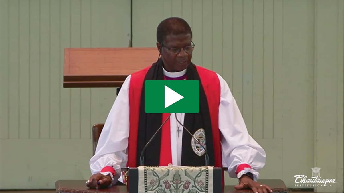 Today on the Chautauqua Amphitheater stage, Chautauqua Institution Senior Pastor, The Right Reverend Eugene Taylor Sutton spoke out against violence following the attack on President Donald Trump and his supporters. Sutton, the former Bishop of the Episcopal Diocese of Maryland, emphasized the importance of fostering dialogue as an alternative to violence, which threatens the foundation of democracy.