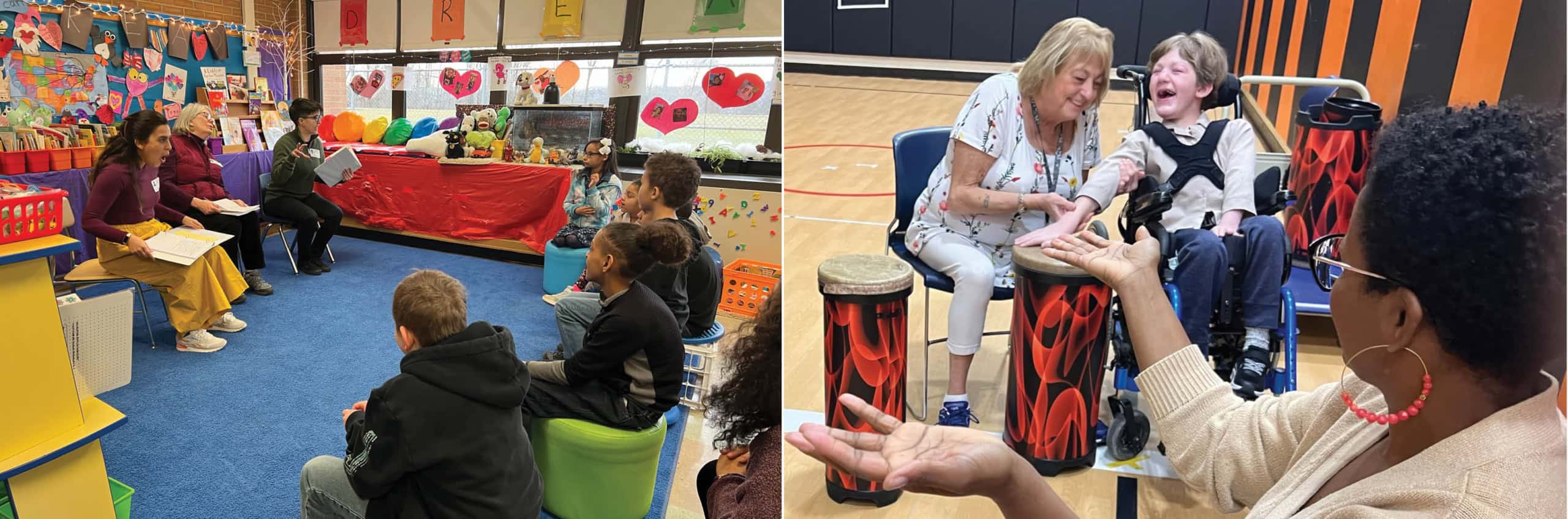 This program was originally designed for students with disabilities. Students are invited to participate by drumming, but also by listening, touching drums, using drum patterns to substitute for verbal language and more. Any means of student expression is welcome – most drum, but many rock to the beat, dance, sing, feel vibrations and/or express on their faces how they are “Feelin’ the Beat.”