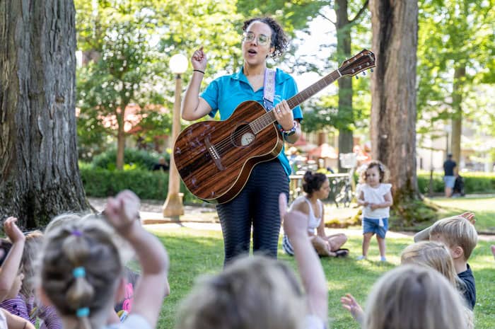 A children's school teacher playing guitar for kids in a park