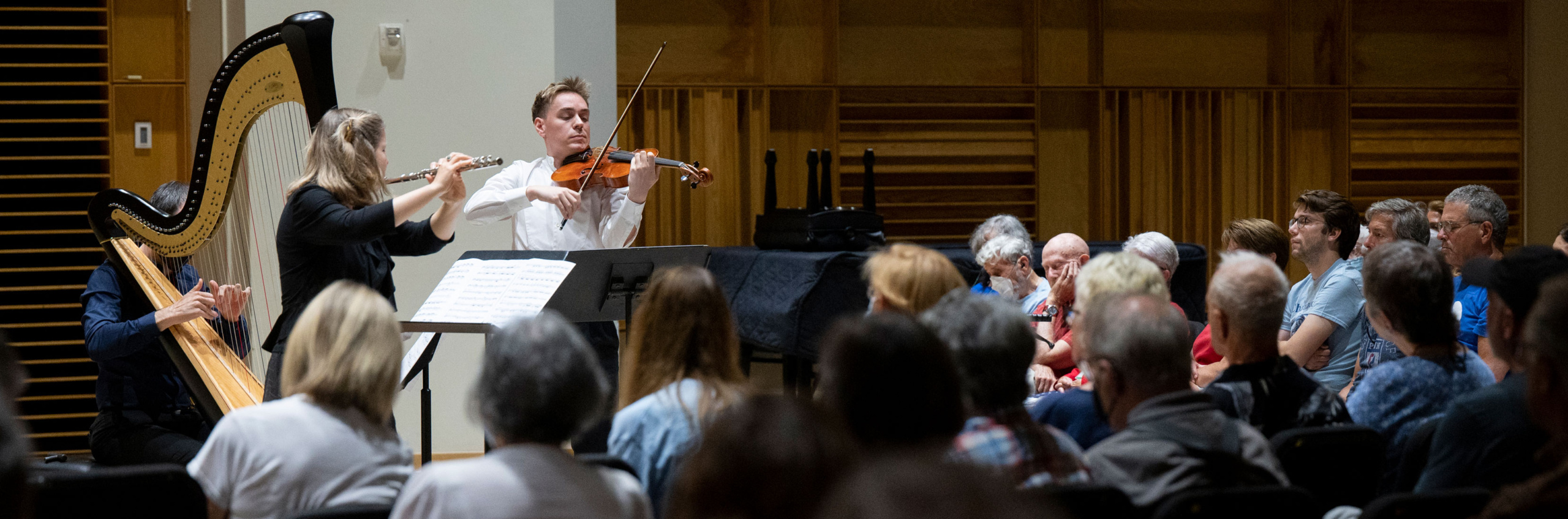At the end of each session every group will perform part or all of the studied repertoire in a public performance. Chamber groups will often include students from our voice and piano program as well as occasional collaborations with dance, theater and the visual arts. Repertoire will range from standard core works to works from historically under-represented composers including women, people of color and composers of our time.